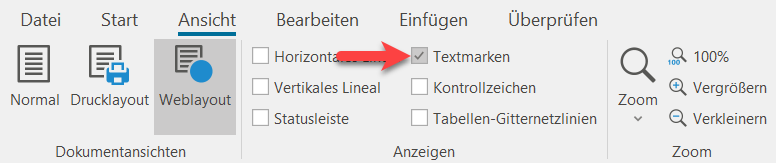 Voraussetzung für die Anzeige des Markers ist die Aktivierung über die Menüleiste "Ansicht".