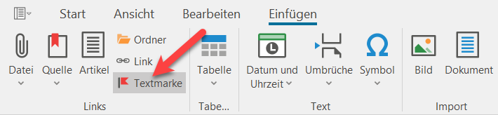 Bevor ein Link zu einer bestimmten Stelle innerhalb eines anderen Artikels gesetzt werden kann, muss eben diese Stelle zunächst definiert und "markiert" werden. Wählen Sie dazu den Artikel mit der (Text-)Stelle aus, nehmen Sie ihn in Bearbeitung und setzen Sie den Cursor an die entsprechende Position. Klicken Sie anschließend in der Menüleiste "Einfügen" auf "Textmarke".