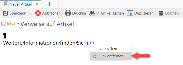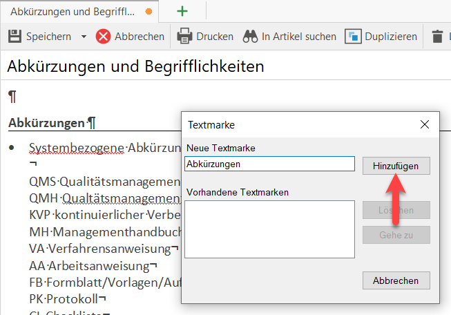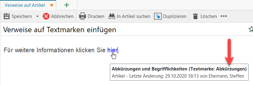 Hinweis: Bevor Sie einen Verweis auf diese soeben gesetzte Textmarke setzen können, müssen Sie den Artikel zumindest zwischenspeichern.