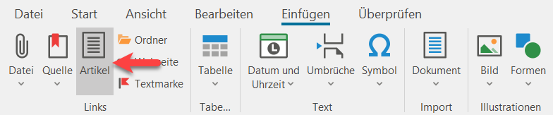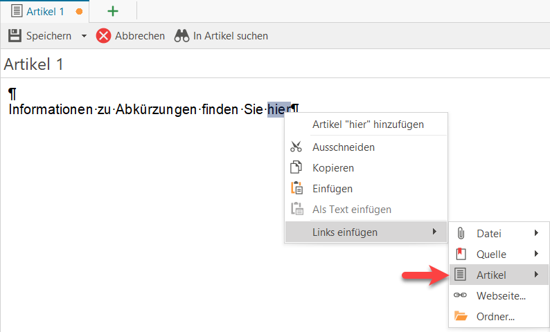 Wählen Sie den Artikel aus, in den Sie einen Verweis auf eine Textmarke einfügen möchten und nehmen Sie ihn in Bearbeitung. Artikel der Textmarke und Artikel, in den der Verweis eingefügt werden soll, können identisch sein. Setzen Sie den Cursor an die Stelle, an welcher der Verweis erscheinen soll, oder markieren Sie den Text für den Verweis. Klicken Sie dann in der Menüleiste "Einfügen" auf "Artikel".