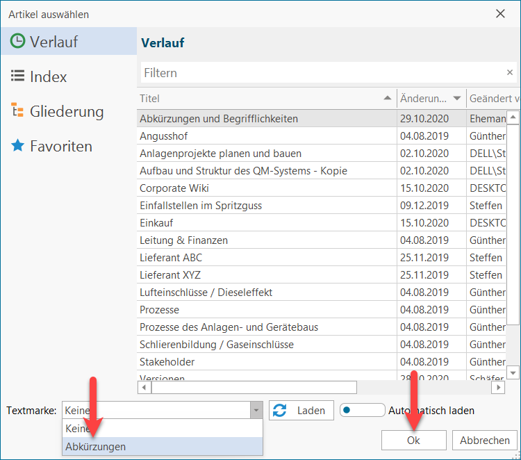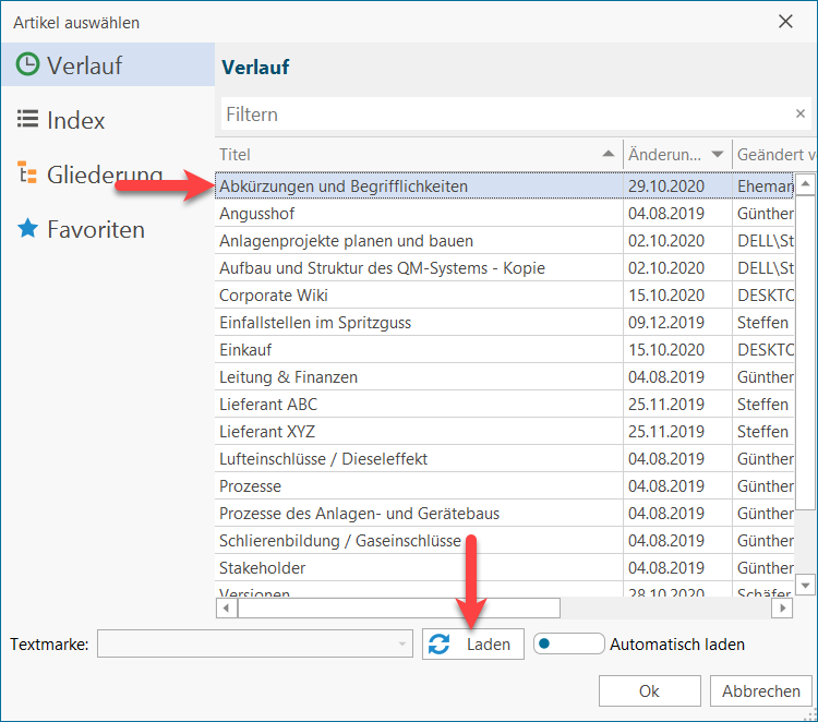 lexiCan öffnet daraufhin ein Dialogfenster. Wählen Sie den Artikel aus, in dem Sie die Textmarke eingefügt haben und klicken Sie auf "Laden".